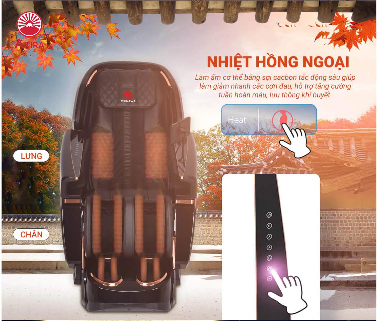Nhiệt hồng ngoại được trang bị vùng lưng và chân hỗ trợ làm ấm cơ thể bằng sợi carbon như ở spa tác động sâu giúp làm giảm nhanh các cơn đau, hỗ trợ tăng cường tuần hoàn máu, lưu thông khí huyết.