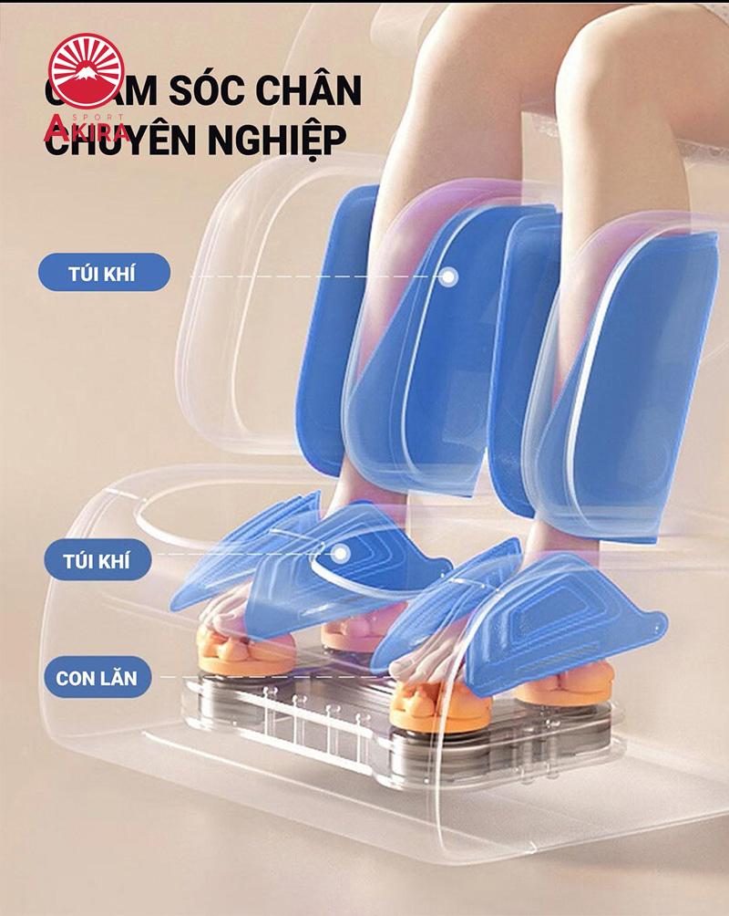 Ghế massage AKIRA OS-326 với chế độ massage chân chuyên nghiệp sẽ giúp bạn chăm sóc đôi chân chuyên sâu. Hệ thống con lăn chuyển động nhịp nhàng kết hợp túi khí sẽ giúp xoa bóp bắp chân và toàn bộ bàn chân giúp bạn giảm nhức mỏi, tê bì và lưu thông mạch máu, huyệt vị dưới lòng bàn chân.