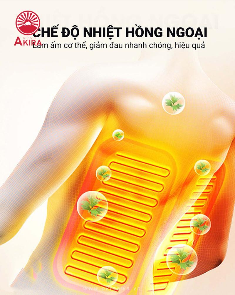 Nhiệt hồng ngoại của ghế massage AKIRA OS-326 với các bước sóng nhỏ, xuyên sâu vào da làm nóng vùng lưng, vùng hông và làm ấm toàn bộ cơ thể. Cơ chế hoạt động này giúp phát huy tối đa tác dụng của các bài tập massage. Giúp giãn nở mạch máu, giãn nở các bó cơ, giúp giảm các triệu chứng đau cho hoạt động nhiều hoặc sai tư thế. Hơn nữa còn hỗ trợ giúp giảm các bệnh xương khớp: thoát vị, địa đệm, gai cột sống…Rất hiệu quả cho người lao động nặng, dân văn phòng ngồi nhiều sai tư thế, người già chức năng xương khớp suy giảm.