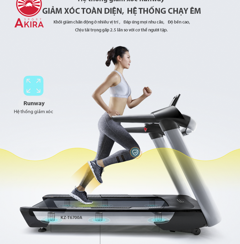 Nhằm tạo ra cảm giác mềm mại, thoải mái cho người tập máy chạy có hệ thống đàn hồi, giảm xóc cải tiến vượt bậc bằng miếng đệm cao su tự nhiên.
